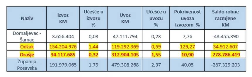 Ne treba biti nikakav ekonomski stručnjak da bi se zaključilo da se u Odžaku proizvodi (stvara nova vrijednost) i izvozi, a u Orašju većinu “gospodarstva” čini trgovina i uvoz stranih roba za daljnju prodaju. Taj, po mnogim parametrima “još gori”, Odžak u našu županiju donese 35 miliona, a Orašje iznese skoro 280 miliona.