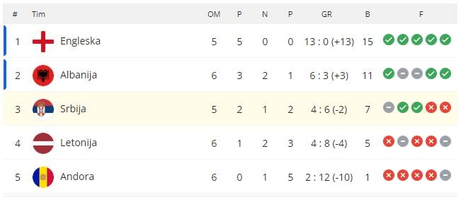 U Srbiji se uzdaju i u brojne druge kalkulacije. Priželjkuju poraz Albanije u Andori te bi im uz poraz Albanije od Engleske bili dovoljni bodovi od Andore i Letonije. Realno, šanse su im male, jako male, ali čuda su moguća.